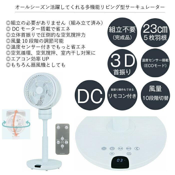 商品情報 商品名 DCリビングサーキュレーター3D首振りサイズ W285×D285×H646~751mm羽根径/枚数 23cm/5枚モーター DCモーター消費電力(50/60Hz) 28W風量調節 10段階切替運転モード ecoモード(温度センサー機能)リズム風・おやすみ風タイマー 12時間切タイマー8時間自動オフタイマー(切り忘れ防止)付属品 リモコン(首振り操作可能)この商品は 【送料無料】DCリビングサーキュレーター 扇風機兼用 DCモーター 扇風機 リビング 温度センサー 3D首振り 立体首振り 上下左右首振り ECO 省エネ 首振り操作もできるリモコン付き タイマー付き 室内干し対策 梅雨対策 空気循環 おしゃれ ポイント 3D首振りで圧倒的な空気撹拌力を実現するリビングサーキュレーター。